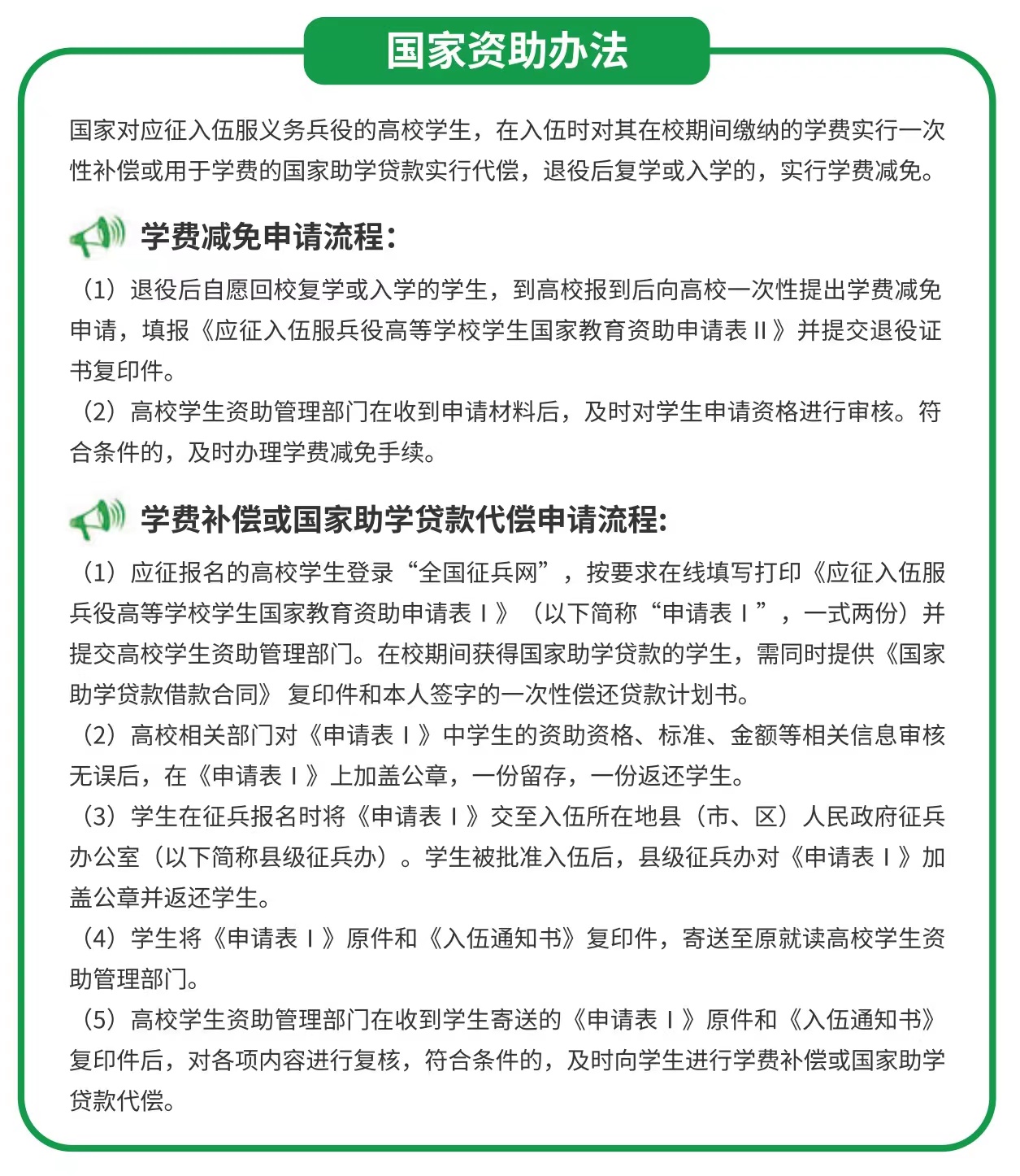 3.国家资助学费:国家对应征入伍服义务兵役高校学生,在入伍时对其在校期间缴纳的学费实行一次性补偿或用于学费的国家助学贷款实行代偿;对应征入伍服义务兵役前正在高等学校就读的学生(含按国家招生规定录取的高校新生),退役后自愿复学或入学的,实行学费减免。学费补偿、国家助学贷款代偿以及学费减免的标准,本专科生每生每年最高不超过12000元,研究生每生每年最高不超过16000元。