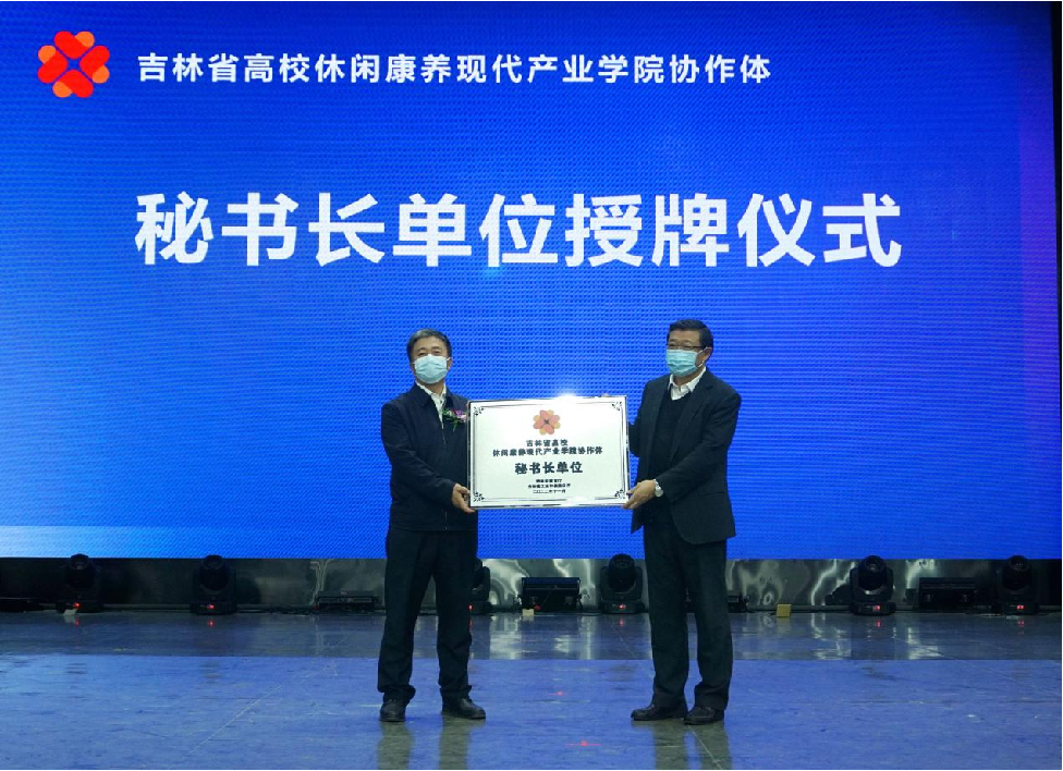 吉林省高校休闲康养现代产业学院协作体成立大会上,吉林省教育厅副厅长刘学军(图左)为协作体秘书长单位授牌