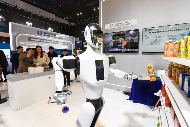 参观者在中国高校科技成果交易会上观看展出的自动售货机器人。杨素平 摄(新华社发)