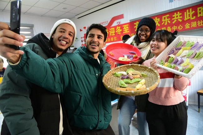 在江苏省镇江市金湖社区,江苏大学的外国留学生与包好的饺子自拍“合影”。石玉成 摄