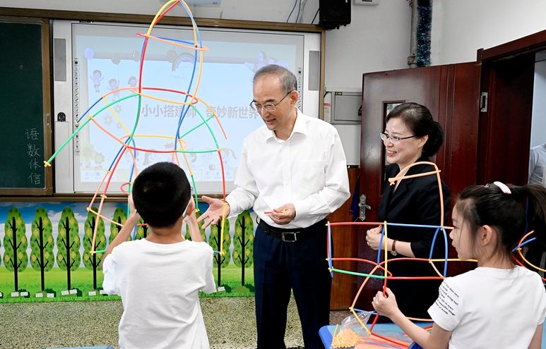 树勋小学始建于1912年,是一所拥有悠久历史的学校。黄强详细了解学校发展沿革,与一线教师代表亲切交流,祝愿大家桃李满天下。操场上,学生们正在进行体育活动。了解到几位指导老师都在擅长领域取得过优异成绩,黄强非常高兴。他鼓励老师们充分发挥特长,让学生们在体育锻炼中收获健康快乐、保持身心愉悦。黄强走进教室,观摩科技、音乐、美术等教学开展情况。观看九三阅兵盛况后,学生们手工制作了坦克、火箭等模型。黄强夸赞他们做得好,希望学生们胸怀远大志向,脚踏实地学习,长大后把祖国建设得更加繁荣富强,叮嘱老师们因材施教、循循善诱,把学生们的爱国心、报国志转化为自立自强、拼搏进取的强大动力。